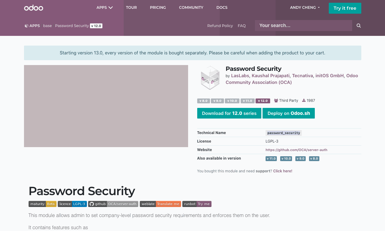 1、首先到 Odoo Apps 的网站下载模组,网址为: https://apps.odoo.com/apps/modules/12.0/password_security/。请注意,要从Odoo App或者 OCA的Github repo下载,OCA官网上下载的版本较旧,可能会有问题。